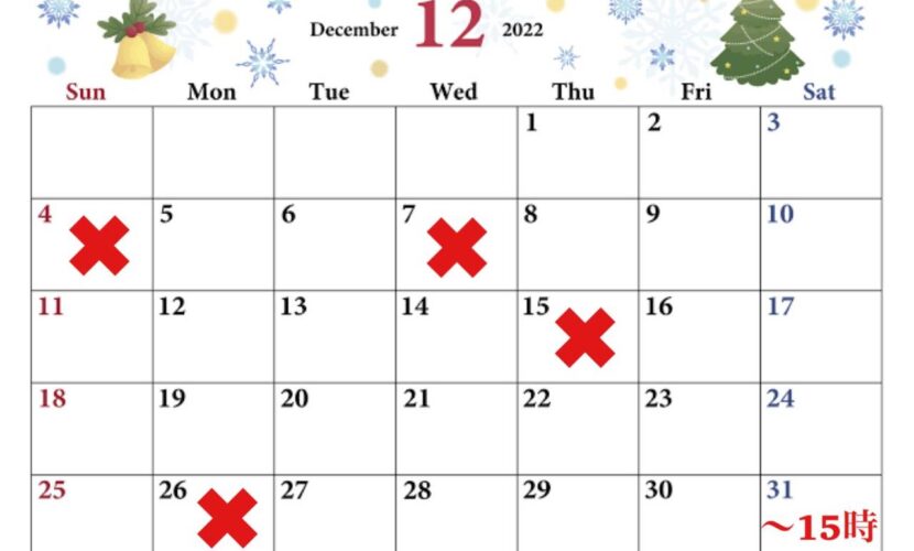 お知らせ 12月のお休み!! 12月のお休み!! 12月のお休み 皆様こんばんは。明日から12月!!1年が早すぎる!! 12月のお休みのお知らせになります 来年に向けて綺麗になって頂きたいのでギリギリまで営業します 31日の大晦日は最終受付が15時になります!! また、年始は4日から営業いたします。 年末にかけて混み合う恐れがありますのでお早めのご予約お待ちしております!! 2023年に向けてすっきり綺麗にしましょ〜